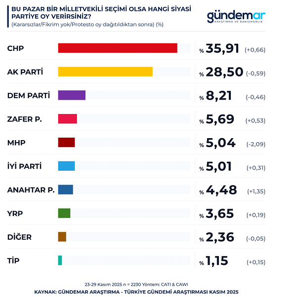 Gündemar tarafından yapılan Kasım ayının son araştırmasının sonuçları ortaya çıktı. 23-29 Kasım 2025 tarihleri arasında 2230 kişiyle gerçekleştirilen Türkiye Gündemi araştırmasına göre, kararsızlar, fikrim yok ve protesto oyların oransal olarak dağıtılmasının ardından CHP yüzde 35,91 ile birinci parti konumunu sürdürüyor. AKP yüzde 28,50 ile ikinci sırada yer alırken, DEM Parti yüzde 8,21, Zafer Partisi yüzde 5,69, MHP yüzde 5,04, İYİ Parti yüzde 5,01, Anahtar Parti yüzde 4,48, Yeniden Refah Partisi yüzde 3,65, diğer partiler yüzde 2,36 ve TİP yüzde 1,15 oranında destek buldu.