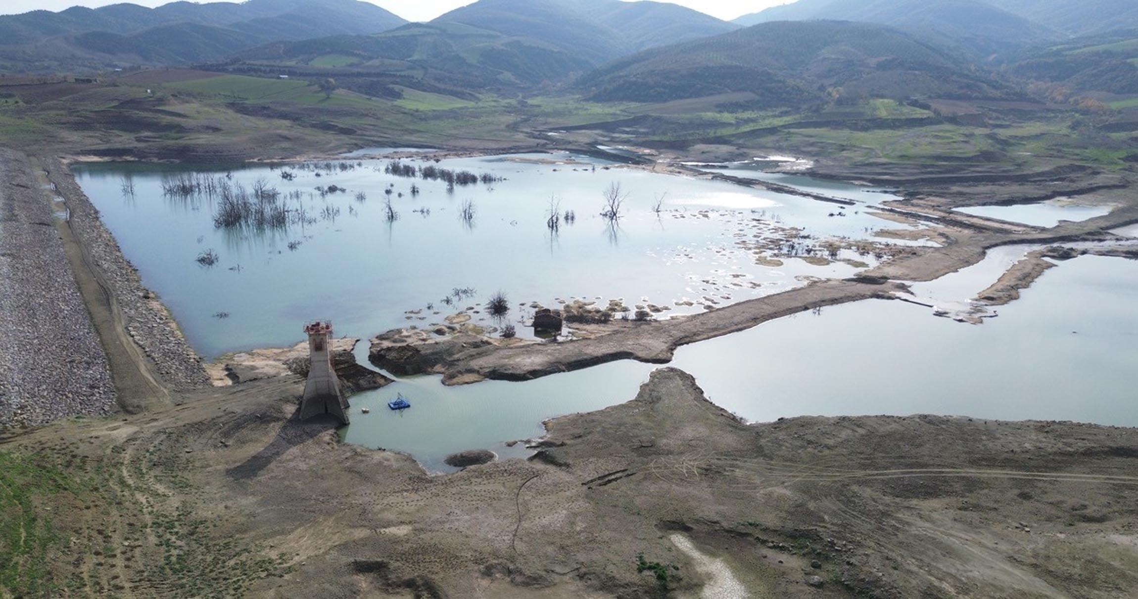 Su seviyesinin yüzde 1’in altına düştüğü barajda, ağaç kökleri ortaya çıktı, adacıklar oluştu. Kuruyan kısımlarda su altında bulunan yapılar ortaya çıktığı baraj dronla görüntülendi.
